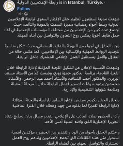 مشاركة عناصر تابعة للجماعة في إفطار نظمته رابطة الإعلاميين الدولية بمنطقة صفاكوي في إسطنبول – تركيا، بتاريخ 15 مارس 2026، الموافق 25 رمضان.