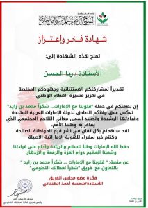 وجاء منح الشهادة بالتعاون مع فريق “شكراً لعطائك التطوعي”، وبرعاية الشيخ الدكتور سلطان بن كايد القاسمي، في إطار مبادرات تهدف إلى تكريم النماذج الفاعلة في العمل الإنساني وتعزيز قيم التلاحم المجتمعي والانتماء الوطني.